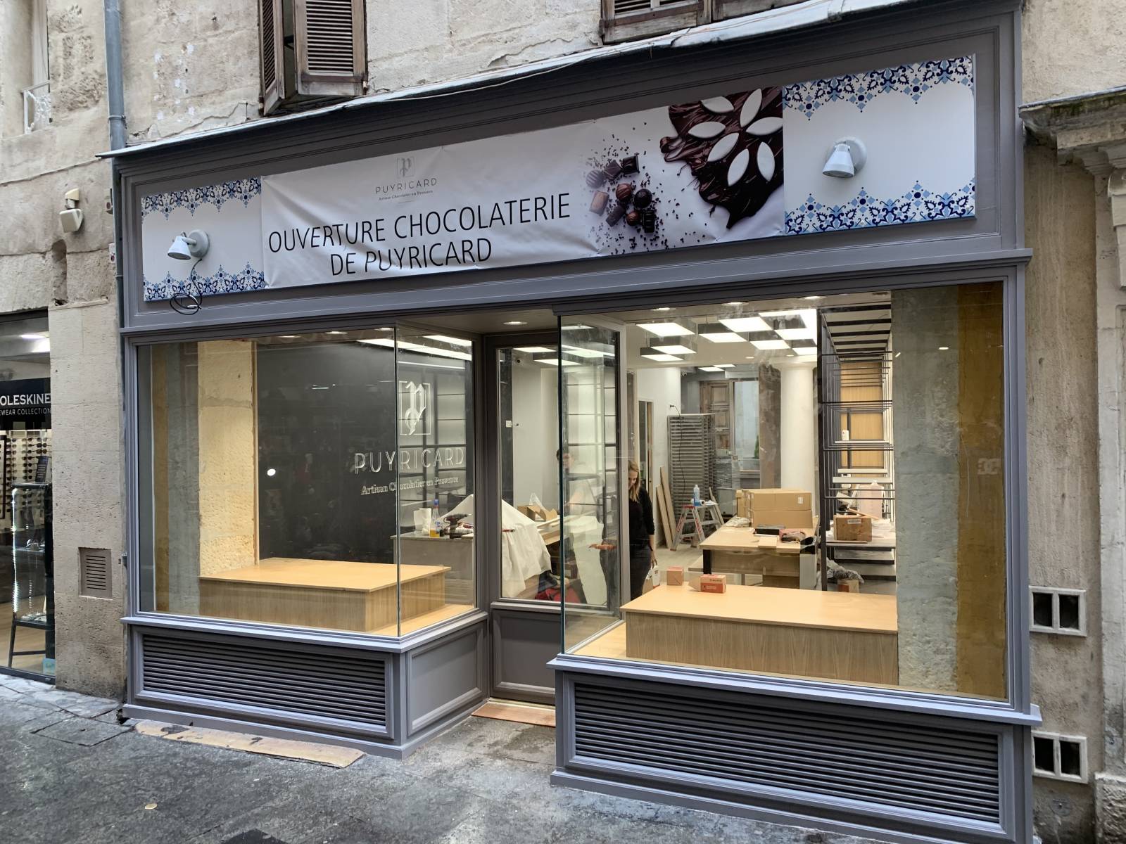 Cette devanture a été réalisé par nos soins pour le nouveau magasin de la Chocolaterie de Puyricard à Nîmes dans le Gard.
